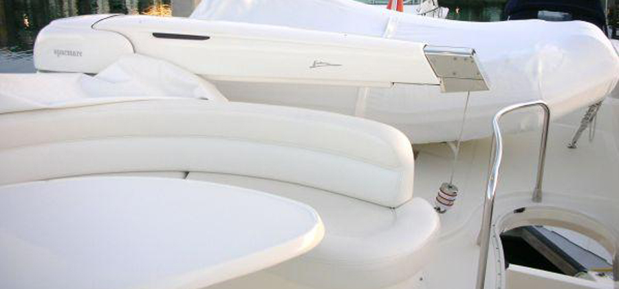 The ample flybridge has easy access from the aft deck. On the flybridge is a wet bar and refrigerator. There is a c-shaped relaxation settee with a table. Opposite is another relaxation area. The control station on the bridge has complete electronics and bow thruster controls. A 13 foot dinghy can be raised by the low profile davit and stored aft of the entertaining area. Remove the dinghy and increase the upper lounge area. The Azimut 55 maximizes the usable area on the flybridge and boat deck.